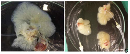 To visualize retention of an intact vascular bed, the DLs (n=6) were perfused with Allura Red dye (Sigma, USA). The dye was injected into the portal vein and the structural components of the vascular tree were clearly visualized in the translucent matrix.