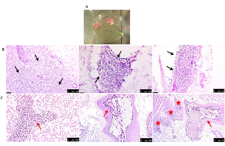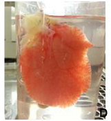 Figure 4 Histology of recellularized rat livers. (A) Gross morphology of recellularized rat livers. The pink colour is due to the culture medium used. Three examples of hematoxylin and eosin staining of rat livers recellularized with human fetal liver stem cells showing presence of cells (blue) distributed in rat parenchyma (black arrows) (B), sinusoids (red asteriks) and blood vessels (red arrows) (C).
