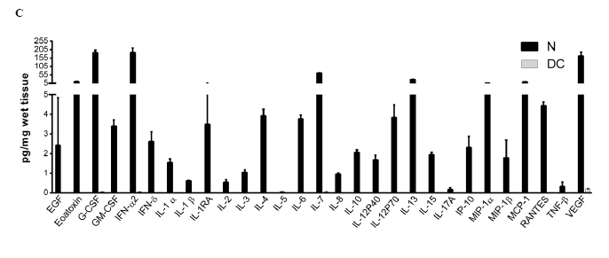 The presence of residual cytokines/chemokines after decellularization was quantified using the Luminex technology. Total protein was extracted from DLs (n=3) and normal rat livers (n=3) using the HCYTMAG-60K-PX30 kit (Millipore USA). Luminex was performed according to the manufacturer´s protocol. Total protein was isolated from approximately 30mg of tissue by homogenization for 4 min in tissue rotor at high speed using the 2140 kit (Millipore, Germany). Proteins from DLs were concentrated by lyophilization and the protein amount was measured at 595nm using standard Bradford method (Bio-Rad, USA) in an ELISA reader (Synergy2, Biotek, USA). The protein amount of all tissues was normalized to same concentration with TM buffer (Millipore, Germany) and loaded onto the Luminex plate. The following 30 cytokines/chemokines were tested: EGF, G-CSF, GM-CSF, IFN-α2, IFN -γ, IL-1α, IL-1β, IL-1RA, IL-2, IL-3, IL-4, IL-5, IL-6, IL-7, IL-8, IL-10, IL-12(P40), IL-12(P70), IL-13, IL-15, IL-17A, IP-10, MCP-1, MIP-1α, MIP-1β, TNF-α, TNF-β, VEGF, RANTES, Eotaxin.