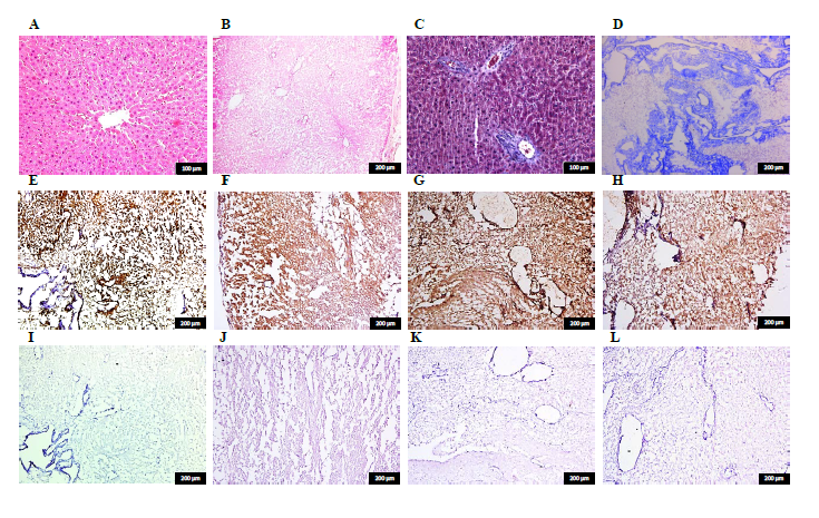 Figure 3 Histology and immunohistochemistry of decellularized rat livers. Haematoxylin and Eosin staining of normal (A) and decellularized rat liver (B) showing presence and absence of nucleic material (blue), respectively. Masson’s trichrome staining of normal (C) showing presence of collagen (blue), pink cytoplasm and black nuclei, while the decellularized liver (D) show presence of abundant collagen but absence of cytoplasm and nuclei. Immunohistochemical stainings of decellularized rat livers showing presence of collagen I (E), Collagen IV (F), Fibronectin (G) and Laminin (H). Negative controls (I-L).