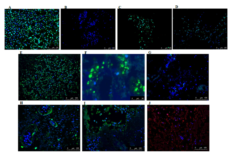 Figure 5 Immunofluorescence staining of recellularized rat livers. TUNEL staining of normal human liver treated with DNaseI (A) shows positive staining (green) for apoptotic cells and living cells (blue nuclei stained with DAPI, while for rat liver scaffolds recellularized with human liver stem cells a great difference in the presence of apoptotic cells was observed between the various livers (B). Representative pictures of positive staining (green) for human specific mitochondrial antigen further corroborated that these cells were of human origin (E). Some of the cells expressed human epithelial cell markers CK18 (green) (F) and CK8 (green) (G). A small portion of cells in recellularized tissue were positive (green) for sinusoidal endothelial marker L- Sign (H), hepatocyte cell marker albumin (green) (I) and fetal liver cell marker CYP3A7 (red) (J), respectively. Nuclei are stained with DAPI (blue).