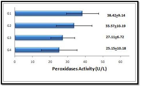 The results of peroxidases activity (U/L) measurement and their specific activity (U/g) calculation in serum samples of the four studied groups are presented in (Figure 3&4 respectively).