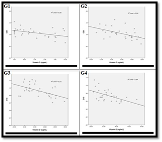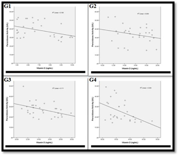 Figure 6 shows the Pearson correlation between the level of vitamin D in each groups (G1, G2, G3 and G4) with their peroxidases specific activity. As it is clear from this Figure, the results prove that vitamin D level has a significant negative correlation with the peroxidases specific activity in all studied patient groups (G1, G2, G3 and G4).