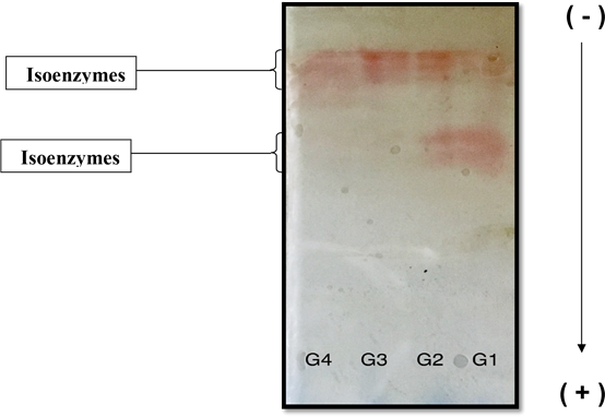 From the above results, it is worth to notice that there is a significant negative association between the peroxidases activity and vitamin D levels (Figures 3–6).Mean while the activity of peroxidases in the patients with sufficient vitamin D level (G4) is near to its activity in patients with that of insufficient vitamin D level (G3). This may suggest that peroxidases activity is influenced by a certain level of vitamin D. Such conclusion was confirmed by polyacrylamide gel-electrophoresis (PAGE) 7.5%, which was used to illustrate the differences in the separation profile of peroxidase isoforms in the serum of the different studied groups. The peroxidase activity was detected for the different bands on the gel, by staining the gel using 4-aminoantipyrine stain. Figure 7 shows the electrophoresis pattern of peroxidases after staining for enzymatic activity in these samples (G1, G2, G3 and G4) groups. Where it is clear that when the gel was stained for enzyme activity, different forms of peroxidase are observed to be present in the serum of the four studied groups. These forms are different in their relative motilities, which reflect changes in their molecular weights and charges. Furthermore it is obvious from the comparison of the peroxidase activity profile that the enzyme in the serum of G1 and G2 sample was detected into two separated zones. While in G3 and G4, only one zone could be detected on the gel. The electro- gram shows that the numbers of bands observed in G1 and G2 are equal, meantime that, which observed in G3 and G4 are equals.