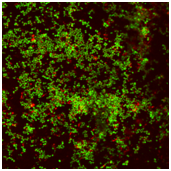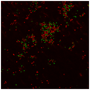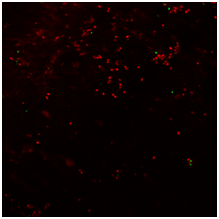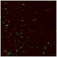 For the examination of tooth specimens under the confocal laser scanning microscope (CLSM) 100µl of prepared fluorescent stain (LIVE/DEAD Baclight stain, Molecular Probes, Invitrogen Detection Technologies) was applied on the sectioned dentin blocks according to manufacturer’s instruction and the blocks were incubated with the stain at room temperature for 15 minutes in a dark environment to enable bacteria to take up the stain. After 15minutes the samples were washed with Phosphate Buffer Solution PBS to remove any residual fluorescent stain. Following this an antifade mountant (Dakocytomation) was applied over the sample and the specimen was then mounted on a slide with glycerine and a cover slip was placed. The samples were then subjected to CLSM imaging at 40X Magnification. The confocal images were analysed and number of live bacteria (Green stained) was estimated (Figure 1-4).