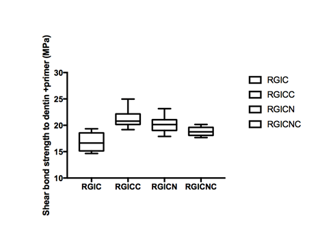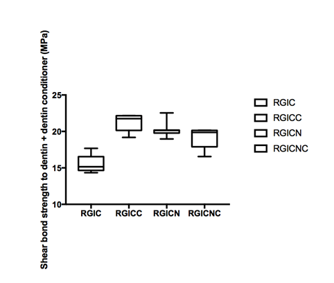 Figure 1A & Figure 1B gives the shear bond strength values (MPa) after 24hours of storage of samples in artificial saliva, respectively, using conventional GIC protocol discussed in the experimental section. In general there was an increase in bond strength of the dentine treated with the modified GIC materials compared to the bond strength of the conventionally bonded teeth.