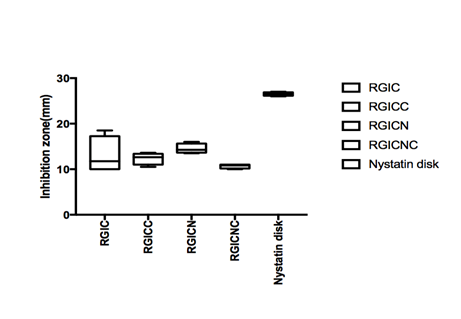 All the test samples gave an average inhibition zone larger than the tetracycline control disc, thereby confirming the antibacterial activity of the different bio-active GIC’s containing combinations against Stapylococcus aureus (Figure 2).15 Using the Student's T-test (p<0.01), there was a significant difference between the rest of the samples when compared to each other and the positive control.