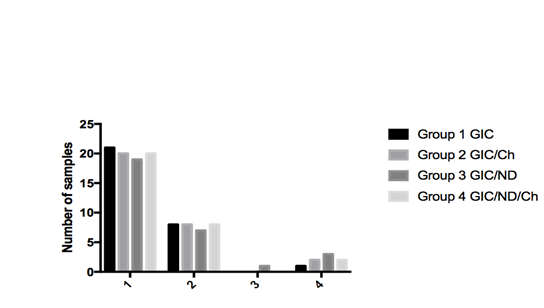 A majority of the samples in groups I, II, III and IV did not reveal any micro-leakage with a score of 0 as depicted in Figure 3. Based on the scores that were tabulated, the p-value was>0.05, thus indicative that there was no significant difference between micro-leakage of glass ionomer cement, chitosan modified glass ionomer cement, nano-diamond modified glass ionomer cement as well as chitosan: nano-diamond modified glass ionomer cements.