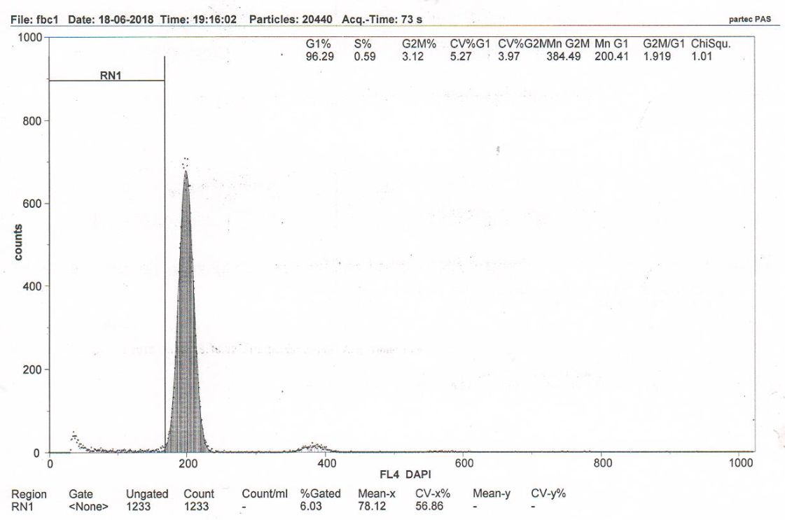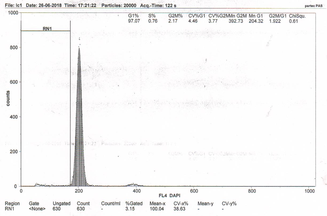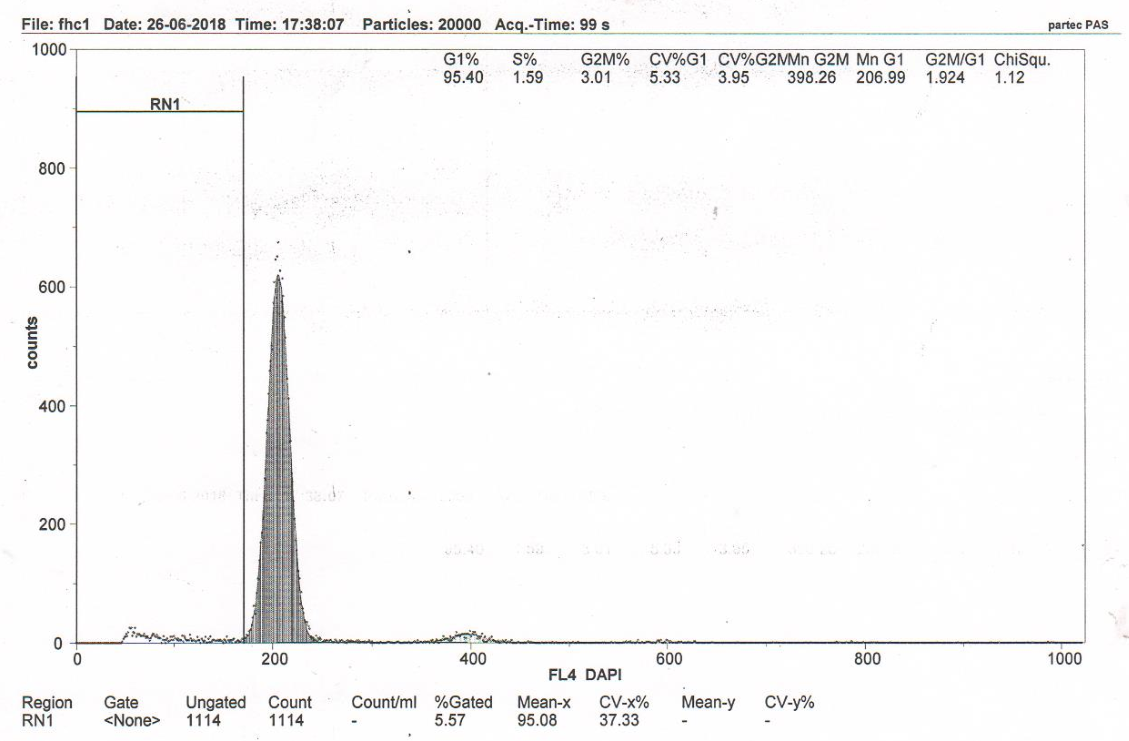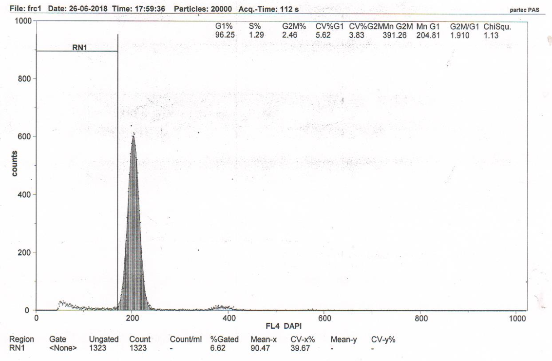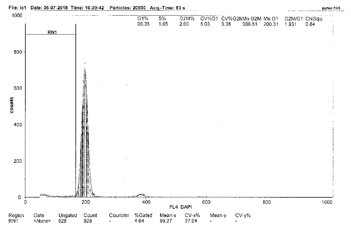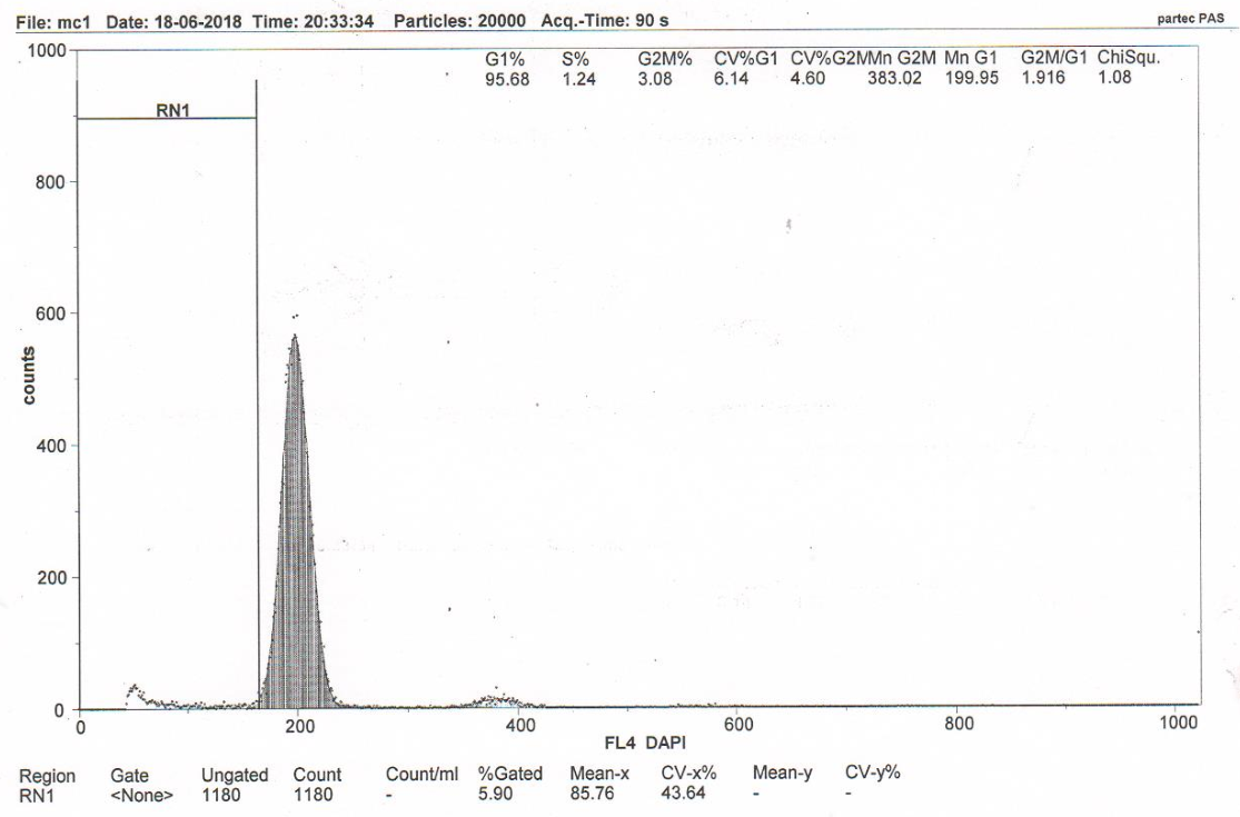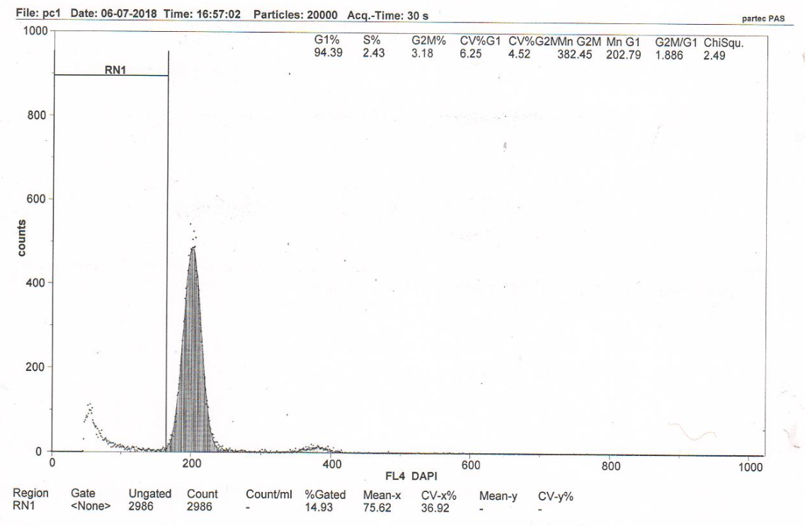 Figure 3A RN1 (Sub-G1)–5.57%. DNA fragmentation in the nuclei of neurons of the somatosensory cortex of the rats with model cerebral IR with transplantation of MSCs from human Wharton’s jellyb (group 3).