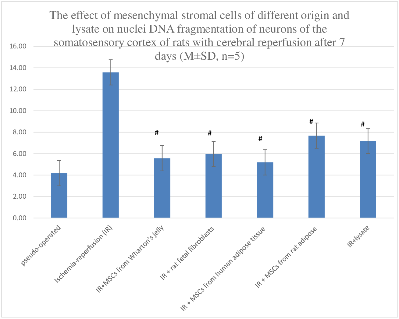 Results: The study noted an increase in the level of fragmented DNA in a group of animals with IR by 3.25 times 7 days after model IR. The performed treatment showed that in groups with transplanted MSCs of various origins and MSC lysate from human Wharton's jelly cells, the intensity of DNA fragmentation in the nuclei of neurons in rat brain somatosensory cortex reliably decreased in1.8-2. 6 times compared with the group of control pathology (IR without treatment).