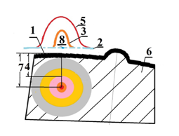 Figure 3 Scheme of the formation of the change in the relief of the temperature field on the skin of the MG at the growth of CrT: 1 - the skin of MG, 2 - the temperature of the MG in the norm, 3 - the relief with an intermediate CrT size 4, 5 - the relief with the minimal CrT 7, 6- tissue in norm, 8- relief at a finite tumor size.