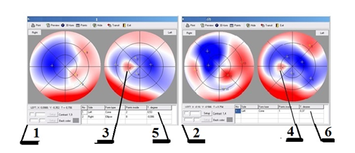 Figure 4 Two DOT mammograms 1 and 2, taken sequentially with an interval in 1 month, demonstrating the degradation of the tumor on the preclinical stage, dimensions of the region of the projection of the gradient (3 and 4), gradients (5 and 6).