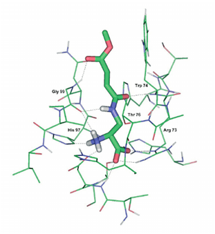 Echinocandins, enfumafungin and, papulacandins are enzyme inhibitors with potent antifungal activity. They act as inhibitors of the biosynthesis of β-(1,3)-glucan, the major components of the cell wall of various fungi.17 Polyoxins and nikkomycins are competitive inhibitors homologue to UDP-N-acetyl glucosamine a substrate for chitin synthesis. Both enzymes inhibitors alter the chitin synthesis and consequently play an important role in antifungal therapy (Figure 4).17 Several enzyme inhibitors affect the cell metabolism fungal. Some inhibitors affect the biosynthesis of amino acid pathway such as 6-carbamoyl-3a,4,5,9 tetrahydro-3H-cyclopenta [c]quinoline-4-carboxylic acid (CTCQC) that reduce the virulence factor and have growth defects. Whereas, other inhibitors affect the biosynthesis of Glucosamine-6-phosphate synthase (GlcN-6-P) that catalyzes the transfer of an amino group from L-glutamine to D-fructose-6-phosphate with the formation of D-glucosamine-6-phosphate. The resultant D-glucosamine-6-phosphate is the substrate for the synthesis of macromolecules containing chitin and mannoproteins.17 The GlcN-6-P inhibitors are a glutamine analog, that act as an active-site-directed inactivator, blocking the N-terminal, a glutamine binding domain of the enzyme, for example N3-(4-methoxyfumaroyl)-L-2,3- diaminopropanoic acid (FMDP), anticapsin are GlcN-6-P inhibitors.18 The interaction between FMDP and GlcN-6-P synthase was well studied by Wojciechowski demonstrate that the amino acids Asp123, His97 and Thr76, serves as the "anchor" mostly responsible for keeping the inhibitor in the binding pocket in addition to several strong and stable hydrogen bonds formed between the amid moiety of the inhibitor and the Gly99 and Thr76 residues present in the binding site (Figure 5).19