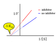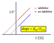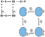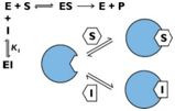 Table 1 a) The three major forms of reversible enzyme inhibition; (b) cartoon representations of the mechanisms for the reversible inhibition of enzyme catalysis. E, enzyme; S, substrate; P, product; I, inhibitor; ES, enzyme–substrate complex; EI, enzyme–inhibitor complex; ESI, enzyme–substrate–inhibitor complex; (c) Linweaver–Burk plots for competitive inhibition, noncompetitive inhibition, and uncompetitive inhibition; (d) effect of inhibition on Michaelis constant(KM) and maximum velocity (Vmax) of the enzyme.13–14
