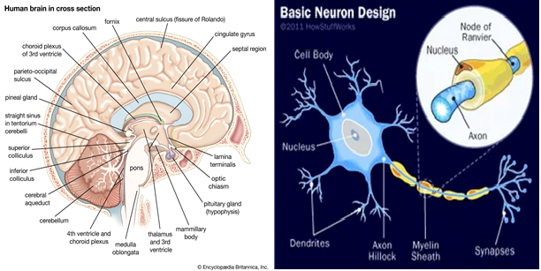 Figure 1 Anatomical depiction of the brain6 (A) and basic neuron design7 (B) illustrating the structure and organization of healthy brain tissue.