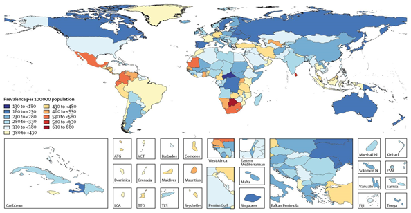 Figure 3 Age-standardized prevalence per 100,000 of idiopathic (unknown, spontaneous) epilepsy for both sexes in the year 2016,25 including specific country abbreviations such as ATG (Antigua and Barbuda), FSM (Federated States of Micronesia), Isl (Islands), LCA (Saint Lucia), TLS (Timor-Leste), TTO (Trinidad and Tobago), and VCT (Saint Vincent and the Grenadines).