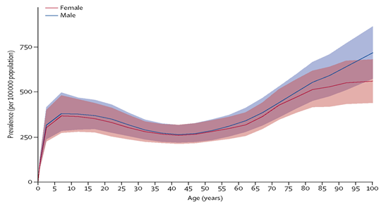Figure 4 Global prevalence of idiopathic epilepsy by age and sex in the year 2016.25 with 95% uncertainty intervals shown in the shaded regions.