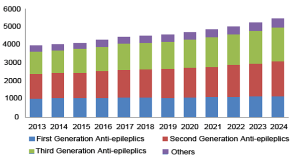 Figure 6 Global epilepsy drugs market by treatment, spanning 2013 to 2024, represented in USD millions.29