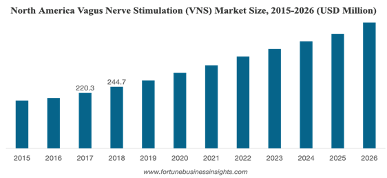 Neurostimulation devices try to control seizures with stimulation. These do involve surgery, but it is considered less invasive because no brain area is removed.31 Examples of neurostimulation include deep brain stimulation, responsive neurostimulation, and vagus nerve stimulation. The North American VNS market size is trending upwards as a treatment method (Figure 7).32