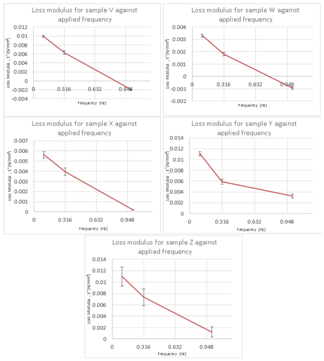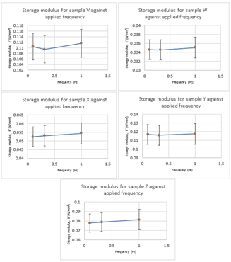 Mechanical analysis of five samples – V, W, X, Y and Z was carried out at three different sinusoid frequencies of 0.1Hz, 0.316 Hz and 1Hz. The reason for these chosen number for frequencies is that at the logarithmic scale, the midpoint for 0.1 and 1 was 0.316 instead of 0.55. The compression test was repeated three times for each sample. The test was conducted at room temperature as biological systems remain at a constant temperature. The storage and loss moduli obtained were converted to correct units with the use of height and diameter from each sample. The mean values of each frequency were used in the final plotting of the graph. The error bars on a graph were calculated using the standard deviation formula below: