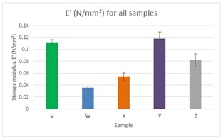 Figure 1 The individual graphs plotted for storage moduli (E’) for each sample demonstrate that all the samples had viscoelastic properties. As the strain rate and frequencies are increased, the sample behaved more elastically. This is evident in the graphs as the storage modulus is increasing for all samples exhibiting elastic properties of the material.