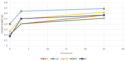 Figure 5 Graph displaying the weighed samples after being immersed in PBS solution for given time periods. Sample X demonstrated poor swelling ability compared to all the other samples. For some samples, the water uptake seemed to be dependent on the chitosan proportion as the water uptake decreased with higher concentration of β-GP. Samples V and W showed to be less viscous compared to the other samples as they both demonstrated poor swelling capabilities.