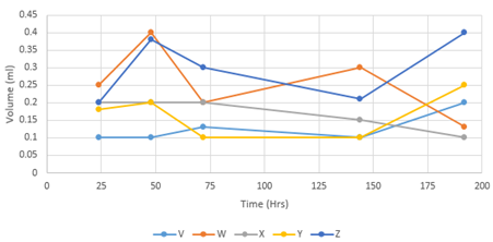 Dried samples were immersed in PBS solution at physiological temperature of 37˚C in an incubator. The volume was measured for all samples at 24, 48, 72, 144 and 192 hours as shown in Table 2. Sample X demonstrated poor swelling ability compared to all the other samples (Figure 5). From 48 to 72 hours, sample W and Y showed poor swelling ability. Sample W and Y showed similar behaviour for first 72 hours. Sample Y remained at a constant volume from 72 hours till 144 hours. Samples V, Y and Z all increased after 144 hours whereas samples W and X both decreased after 144 hours. For some samples, the water uptake seemed to be dependent on the chitosan proportion as the water uptake decreased with higher concentration of β-GP. Samples V and W showed to be less viscous compared to the other samples as they both demonstrated poor swelling capabilities.
