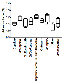 The Copazan Herbal Gel with Bee polis has been tested using Chatillon apparatus for force measurement.14 This method determines the maximum force and work needed to separate two surfaces in intimate contact. The Copazan Herbal Gel with Bee polis and combination of the starting materials (0.1g) were homogeneously spread on a 1cm 2glass disks and then the disks were fixed to the support of the tensile strength tester using double side adhesive. The gel was brought into contact with the commercially available pig skin, in order to simulate the skin attachment or the contact with slice of pig skin was established in order to imitate adhesion of the gel to the skin structure, after a preset contact time (1min) under contact strength (0.5N) the 2 surfaces were separated at a constant rate of displacement (1mm/s). The strength was recorded as a function of the displacement, which allowed to determine the maximal detachment force, Fmax, and the work of adhesion, W, which was calculated from the area under the strength-displacement curve.