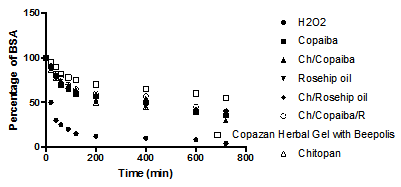 When wound occurs, it is generally accompanied by classical symptoms of inflammation, such as pain, redness and edema. In the inflammation stage, the main aim is the removal of debris, damage tissue, and bacteria by neutrophils and macrophages, which have a role in antimicrobial defense and debridement of devitalized tissue by production of proteolytic enzyme and reactive oxygen species.32–34 The amount of uncontrolled ROS is the main cause of the inability of healing process to continue and therefore it would be ideal to utilize the antioxidant capacity of the designer hydrogels “to detect and able to “fight the free radical excess” have been assessed using previously described model using well-established that HO radical can be generated from a reaction known as the biologic Fenton reaction and this reaction requires the presence of H2O2. Figure 3 demonstrates the affects of the various antioxidant containing gels in comparison to Copazan Herbal Gel with Beepolis on the solubility of the BSA protein as an in vitro measure of the free radical defense capacity of the biomaterial in the bench mark wound healing model. Further work is on the way in our laboratory to evaluate the performance of the Copazan Herbal Gel with Beepolis in the extended in vitro model and eventually in in vivo model.