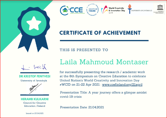 Figure 1 Certificate of Achievement awarded to Prof. Laila M. Montaser from 8th Symposium on Creative Education, 21-22 April 2021; Finland.