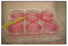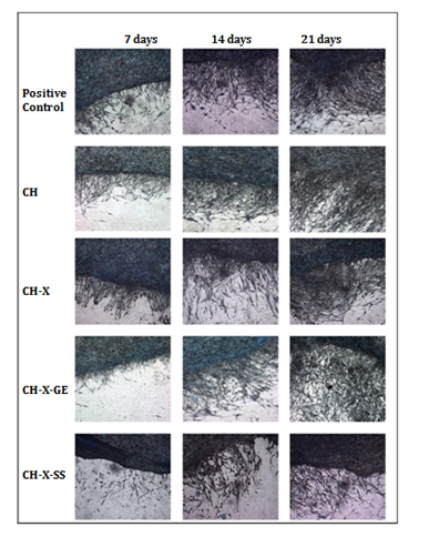 Therefore, in this present work, we evaluated the healing potential of chitosan and chitosan-blocked hexamethylene diisocyanate cross-linked films loaded with gentamicin and silver sulfadiazine on an in vitro wound healing model. For the in vitro model, human MG-63 cells, a cell line derived from an osteosarcoma, were seeded in six-well tissue culture plates (Corning Co, USA). The seeded cells were incubated in α-MEM (Minimum Essential Media Alpha Medium) with 5% fetal bovine serum (FBS) and humidity atmosphere of 5% CO2 and 95% air at 37˚C. After cells reached confluence, wounds were created across the surface of each well (Figure 1A) and the media were replaced. The wounds were then microscopically examined to ensure that cellular and extra-cellular materials were completely removed from the wound sites (Figure 1B). At this moment, the chitosan-based films, previously prepared by solvent evaporation technique and sterilized using UV light (Table 1), were placed in each of the wells, and the positive control was a well with no film. The experiment was carried out on duplicates. The culture medium was replaced at every two days in order to provide essentials nutrients for cellular growth. The wound filling rate was observed for three weeks (21 days). After 0, 7, 14 and 21days of incubation, films were removed from the wells and cells were stained with 20ml of T-blue stain for 2 minutes at 37˚C. After staining, all media were removed and cells were washed with 1ml of 0.1M phosphate buffer solution (PBS) pH 7.4. Then, PBS was removed and 1 ml of formalin was added. Cells were kept at 4˚C for 24hours and, after this procedure, formalin was replaced for ethanol 70%. At this moment, the wound filling rate was analyzed using a microscope with photography apparatus. The wound filling rate was qualitatively determined by the amount of cells that grown in each wound site at each analyzed period (Figure 2). According to Figure 2, CH and CH-X films did not show deleterious effects on cell growth during the studied period if compared to the positive control (no film), suggesting that both films are biocompatible and BBDI are non-toxic to MG-63 cells. In fact, no significant difference was observed for the wound filling rate of these films, but stimulation on cells growth by CH at day 7 might be suggested. Ueno et al.17 reported that chitosan stimulated migration and proliferation of fibroblast and collagen production in a dog wound healing model. Moreover, wound healing experiments using mouse as model have shown that the application of chitosan hydrogel onto an open wound induced significant wound contraction and accelerated wound healing.18 Xu et al.19 reported the biocompatibility of a genipin-chitosan hydrogel on a rabbit model. In addition, glycerol phosphate-chitosan hydrogel was assessed in experimental osteochondral joint defects in horses and did not cause relevant clinical effects, inflammatory response or toxic effects in the joints.20 Chitosan films were also evaluated on wound repair of horse distal limb and they had not interfered on healing time in the equine model,21 suggesting compatible results of in vivo wound model and this reported in vitro wound model. On the other hand, the gentamicin-loaded crosslinked chitosan film CH-X-GE showed inferior wound filling rate when compared to positive control in the first week. Lin et al.22 reported that application of 2% gentamicin eye drops in porcine cornea significantly disturbed the corneal epithelial healing rate. Cooper et al.23 investigated the cytotoxic effects of gentamincin on human fibroblasts and keratinocytes, which play an important role in wound healing, and found profound effects of gentamicin on these cells. Bertolaso et al.24 reported the biochemical mechanism underlying gentamicin cytotoxicity in OC-k3 cells. Although gentamicin ototoxicity and neuphrotoxicity have been extensively studied, the dose-dependent deleterious effects of gentamicin have not been well established yet.25,26 Hancock et al.27 studied the retinal toxicity of gentamicin in vivo and in vitro and reported reversible toxic effects in short-term exposure to gentamicin, while irreversible retinal damages were observed after prolonged gentamicin treatment, suggesting besides dose-dependent, toxicity of gentamicin is also time-dependent. After 14 and 21 days of incubation, CH-X-GE film deleterious effects on wound filling were not observed anymore in our in vitro wound healing model (CH-X-GE wound filling rate is similar to positive control, CH and CH-X films). This can be attributed to the decrease on gentamicin concentration in the media, since burst release happened in the first week and then minimal amount of gentamicin was controlled released by CH-X-GE films during the following two weeks.28 Again, the proposed in vitro wound healing model showed analogous results to those found in vivo, suggesting a dose and time-dependent effect of gentamicin on the wound filling rate. Contrary, silver sulfadiazine-loaded crosslinked chitosan film CH-X-SS showed reduced wound filling rate during all the analyzed period. Silver cytotoxicity id related to its accumulation in the body.29 Thus, the decrease on the amount released by the CH-X-SS trough the weeks does not reduce the cytotoxicity observed at 7, 14 and 21 days of incubation. Lee et al.30 also reported the cytotoxic effect of silver sulfadiazine on HaCaT cells and the delayed epithelialization in an animal model. In addition, Mi et al.31 observed a marked inhibition of 3T3 fibroblasts growth caused by 1% silver sulfadiazine cream treatment. According to authors, fibroblasts inhibition was significantly reduced by the use of silver sulfadiazine incorporated to an asymmetric chitosan membrane.31 Poon et al.32 studied the cytotoxic effects of silver on keratinocytes and fibroblasts in vitro. According to their results, silver is highly toxic to both keratinocytes and fibroblasts, which play an important role 