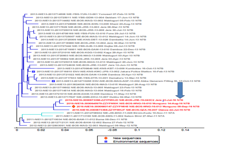 Figure 1, shows the phylogenic tree of the VP1 sequence of the wild isolate obtained from apparently healthy child, NIE-BOS-JRE-16-44C2 was PV1 WEAFB1 orphan virus in cluster N7B (Arrow).The closest matching viruses are NIE-BOS-DAM-13-005and NIE-BOS-BAM-11-012 at 95.8% nt. VP1 identity (38 nucleotides different). This shows that the virus has been in circulation since 2011 indicating a surveillance gap and poor immunization coverage.