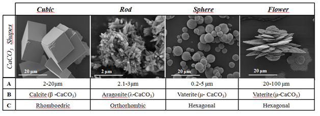 Figure 1 The typical shapes of calcium carbonate (CaCO3) particles.