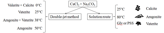 Figure 2 Differences between two methods (Double-jet and soluction route) for polymorphic calcium carbonate production using the same reagents [30,34,35].