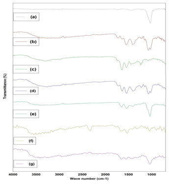Figure 1 FTIR Spectra of HCG based scaffolds. (a) HA (b) Chitosan (c) Gelatin (d) Chi-Gel (e) HCG (f) HCGA (g) HCGP.