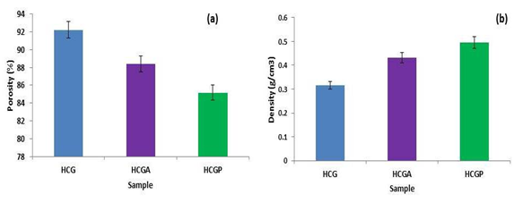 This high degree of porosity would allow cells to migrate into and populate within the scaffold. Density of the scaffolds was measured by using liquid displacement method using ethanol. Among the samples the highest density was in HCAP sample (0.495g/cm3) and the lowest was HCG sample (0.317g/cm3) (Figure 2B). The apparent density of trabecular bone ranges from 0.14 to 1.10g/cm3. The density value increased from due to the denser packing of polymer network and as expected led to a decrease in porosity.31,32