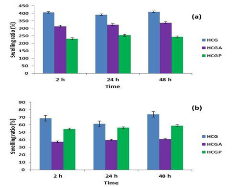 The swelling ability of scaffold was studied by immersing these scaffolds in 1×PBS solution. The results showed that there are differences in the swelling behavior among the scaffolds, where the water uptake ability of the HCG scaffold was higher when compared to other scaffold. The surface generally increases upon swelling of the scaffold, which is suitable for more cell adhesion and infiltration.