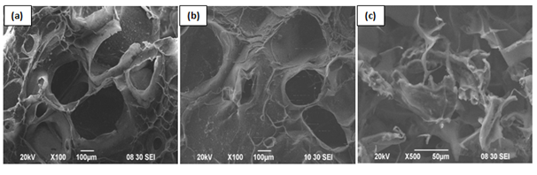 Pore morphology: The pore size and surface morphology of the bio composite scaffolds were studied using scanning electron microscopy (SEM JSM-6490LV, JEOL, Tokyo, Japan). Briefly, scaffold samples were cut into small pieces and fixed on carbon tape, then dried under vacuum and platinum coated before examining under SEM.