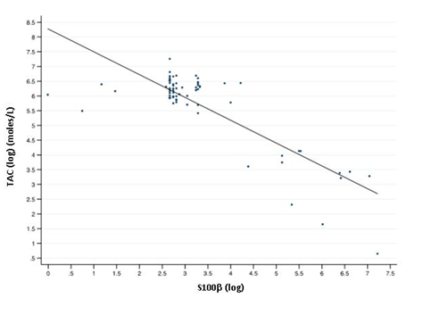 To study the relation and potential effect of confusion factors, we applied a linear regression model in the group with neurological perinatal antecedents. The only variable which maintained a significative statistical relation with levels of S100β was TAC (β=-0.864, 95% confidence interval =-1.001a-0.720, R2=0.6697, p<0.000).