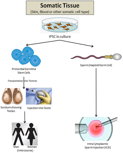 Figure 1 Patient specific IPSC can be derived from the patient somatic tissues and differentiated into germline stem cells, followed by transplantation into patient testes. This method seems to have potential to re-establish spermatogenesis and natural fecundity. It may also be feasible to differentiate IPSC directly into sperm that can be used to fertilize eggs by ICSI.