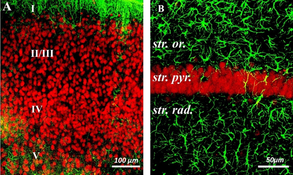 B–CA1 zone of the hippocampus. Marked layers: st. or – stratum oriens, st. pyr. – stratum pyramidale, st. rad. - stratum radiatum. Double immunohistochemical staining. NeuN-positive neurons are colored red, GFAP-positive astrocytes are colored green. Scale bars: A = 100µm, B = 50µm.