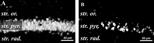 Designation of layers in the CA1 zone of the hippocampus: str. or – stratum oriens, str. pyr. –stratum pyramidale, st. rad. –stratum radiatum, st. lac.-mol. – stratum lacunosum-moleculare. Scale= 100µm.