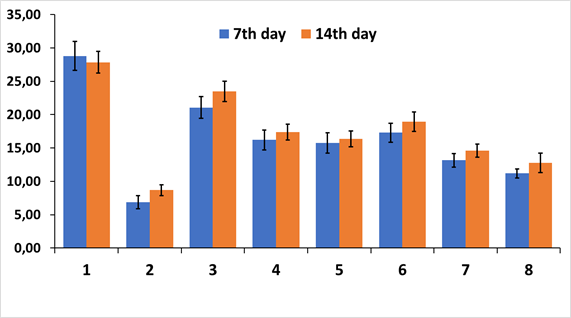 Experimental groups (1-8) are plotted on the abscissa. ordinate axis - conventional units (c.u.)