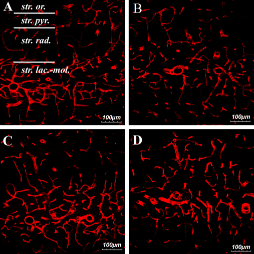 Figure 6 Confocal images of RECA-1-positive vessels in the CA1 zone of the hippocampus on the 14th day after ischemia-reperfusion.