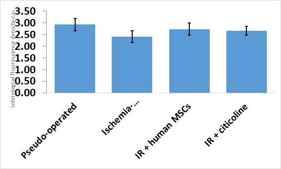 All treatment options (groups 3-8) demonstrated a statistically significant increase in fluorescence intensity compared to the 2nd group of animals (group IR). The use of human umbilical cord Wharton's jelly MSCs (group 3) showed the best result and the integrated fluorescence density of NeuN-positive neurons in this group was 21.07x106 ± 1.37 c.u. (7 days) and 23.48х106 ± 1.64 c.u. (14 days), but did not reach the values of the control group of pseudo-operated rats: - 28.79x106 ± 2.35 c.u. (7 days) and 27.84х106 ± 1.72 c.u. (14 days). Also, the integral fluorescence density of NeuN-positive neurons in group 3 was statistically significantly higher compared to citicoline (reference drug) both on the 7th and 14th day of the study.