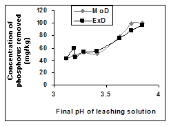 indicates that the removed phosphorus concentration, is inversely proportional to both the final pH of the leaching solution and weight input of the iron oxide and their product (Table 1).