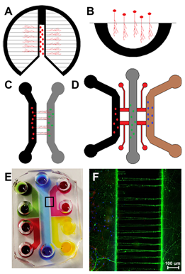 The basic design of microfluidic models demonstrated in Figure 1C-CF have become a gold standard for in vitro neural models due to their many advantages over other model types: unlimited design opportunities allowing for increasingly complex designs over time, very specific localisation of cells and/or chemicals, higher throughput, can be scaled up, highly sequential/parallel experimentation, extremely small volumes of media/chemicals per experiment (reducing cost), micro-channels allow fluidic isolation between compartments stopping the spread of treatments between chambers, greater control over cell patterning/manipulation, greater control over extracellular and cellular microenvironments, visible to conventional microscopes when made with optically transparent material (e.g. PDMS) and are low-cost disposable devices.103,104