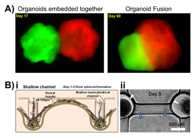A similar neurospehere network produced by Jeong et al.136 to study signal transmission through the CNSas a result of the partial breakdown in this system seen in Alzheimer’s disease. Shallow (70µm) and deep (300µm) hemicylindrical channel networks between concave wells seeded with neural progenitor cells formed a self-aggregating network, Figure 2B. During this formation the cells differentiated into neuronal and glia cells that secreted laminin and formed an extracellular matrix (ECM) around the spheroids. Axonal signalling was recorded being transmitted between the spheroids, detected by Ca2+ flux imaging.136 Further models are summarised and reviewed in.137,138