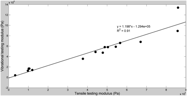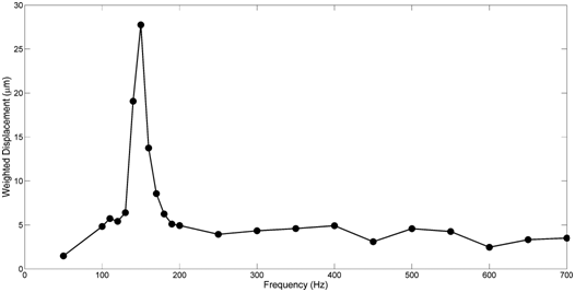The use of vibrational analysis in concert with OCT allows one to measure the resonant frequency and mechanical properties of ECMs and implants non-destructively and non-invasively (Figure 5) (Figure 6) at different strains.6,12 Since the measurements at different strains using vibrational analysis yield different resonant frequencies, this data can be used to calculate the elastic modulus from incremental testing of ECMs and implants relatively quickly. It is important to match implant mechanical properties with that of the host tissue to reduce the degree of up-regulation of mechanotransduction. Up-regulation of mechanotransduction may lead to increases in capsule formation and tissue hyperplasia at the tissue-implant interface.