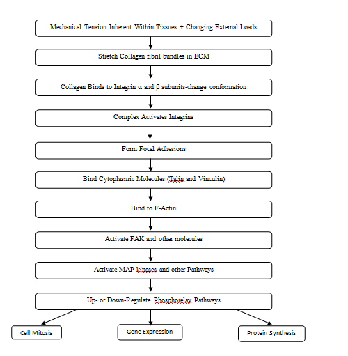 Phosphorelay pathways can be activated not only by integrin binding to ECMs, but by direct stretching of the following: cell membranes, ion channels, intracellular junctions, and growth factor and hormone receptors. Activation of these moieties leads to changes in protein synthesis, altered gene expression and cell mitosis.19 (Figure 7). All these events occur at the cell-allograft and cell-tissue engineered material interface and dictate rate, composition and extent of tissue in growth. Providing the correct boundary forces and stresses to equilibrate the implant-tissue interface is important to prevent cellular hyperplasia and excessive collagen deposition.